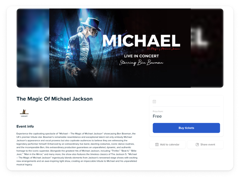 ارتقِ بموقع بيع التذاكر الخاص بك بواسطة ميزات البحث المتقدمة والفلاتر والتقاويم والمزيد. مثالي لإدارة العديد من الفعاليات.