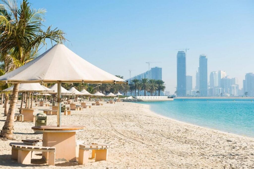 A family-friendly favorite, Al Bateen Ladies Beach offers a peaceful shoreline experience with dedicated access for women and children. Open daily from 10 AM to 10 PM, this beach features calm waters and clean facilities, perfect for a relaxed day out. Entry is AED 25 for adults and AED 5 for children aged 3 to 11, with free access for kids under 3. It’s an ideal option for mothers, families, or solo visitors seeking a safe and welcoming beach atmosphere.