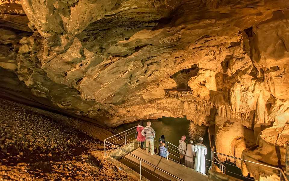 Near the town of Al Hamra, Al Hoota Cave invites you into Oman’s underground world. This natural limestone cave stretches for over 4.5 kilometers (though only a part is open to the public), showcasing massive stalactites and stalagmites, underground lakes, and even rare blind cavefish.