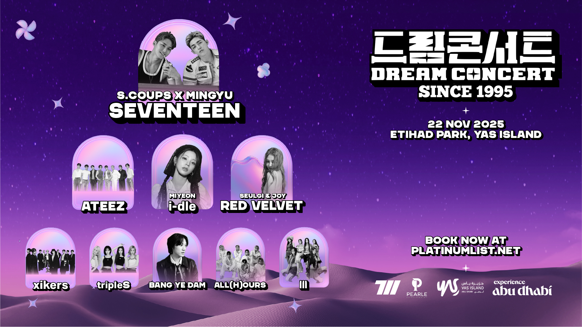 For Abu Dhabi 2025 Dream Concert lineup has just been announced: S.Coups X Mingyu (SEVENTEEN), Ateez, I-DLE (Miyeon), Red Velvet (SEULGI & JOY), Xikers, TripleS, Bang Ye DAM, All(H)ours, and iii. This is only the beginning to the excitement of this historic Middle East debut.