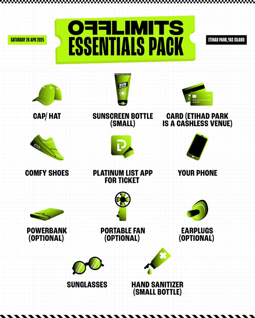 - Your OFFLIMITS Essentials: Don’t forget to pack the must-haves: your card (Etihad Park is a cashless venue), your phone with the Platinumlist app for easy ticket access, sunglasses, a hat, and hand sanitizer. Optional but handy extras include earplugs, a power bank, and a portable fan—especially if you’re planning to stay all day!