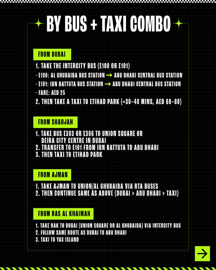 Taxi/Drop off: Request drop-off at the Ferrari World valet area, where drop-offs for People of Determination are permitted. After drop-off, head to the Customer Service Information Point nearby, where assistance will be provided for your transfer via transportation van to Etihad Park.