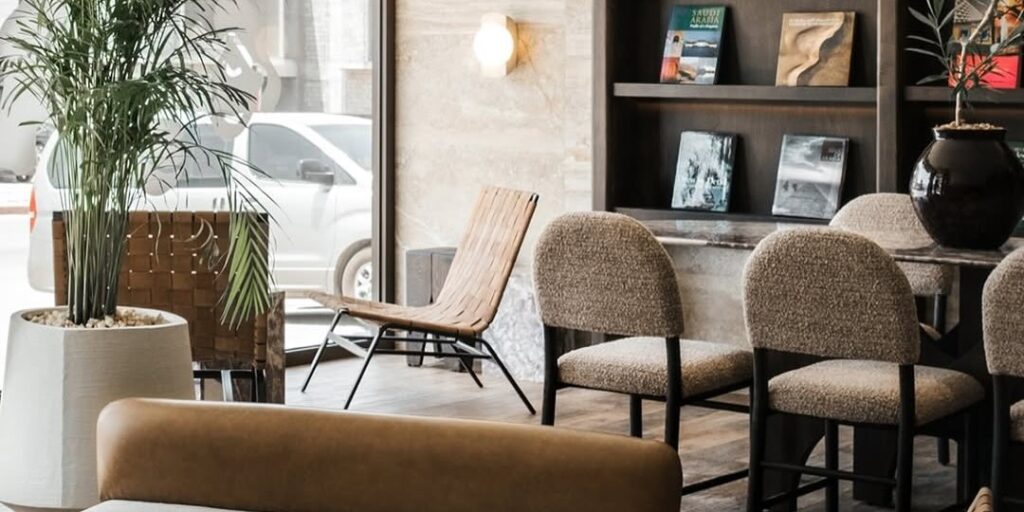 Inside, the cozy atmosphere continues with warm wood tones, plush seating, and some greenery. It’s a relaxed space that makes it easy to unwind while you sip your coffee.