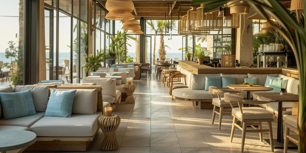 The interiors embrace wood, rattan, and plenty of greenery, creating an open, breezy environment that encourages lingering. Warm tones and tactile materials give the space a welcoming feel, while relaxed seating invites you to stay for breakfast, an afternoon catch-up, or a slow lunch.