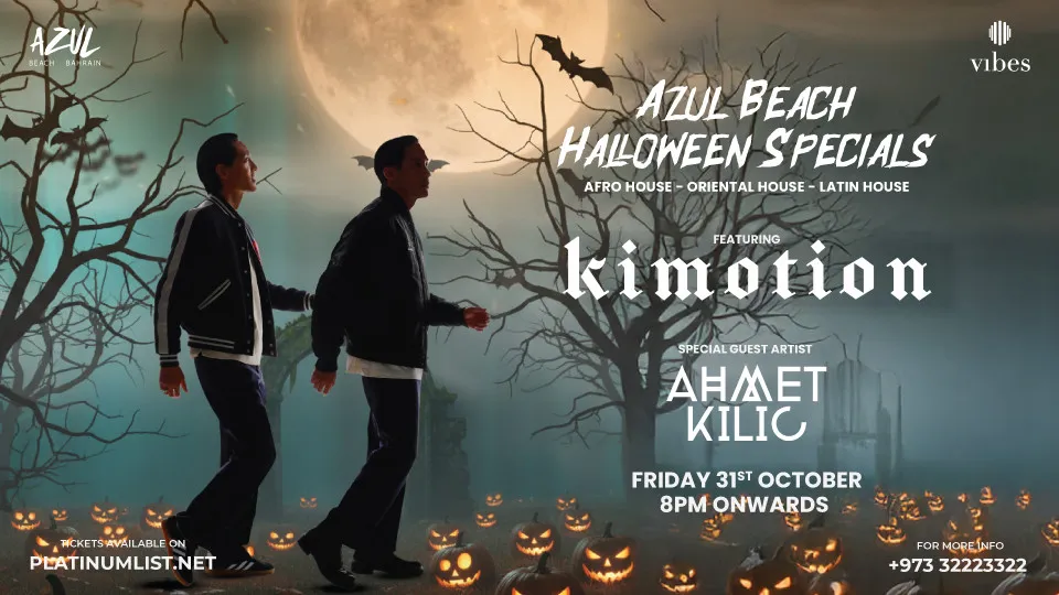 Get ready for a wicked night by the waves at Azul Beach! The Halloween Specials bring you Kimotion and Ahmet Kilic live, setting the scene for one of the top Halloween events in Bahrain. Picture eerie lights, glowing masks, and an ocean breeze laced with mystery. It’s the perfect mix of spooky and chic, where beach vibes meet midnight madness.