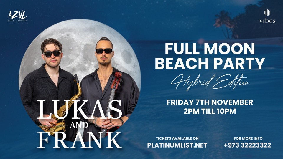 Dance under the stars and the moonlight at the Full Moon Beach Party Bahrain, headlined by Lukas & Frank. With tropical beats, glowing lights, and that unmistakable island vibe, this is one of Bahrain’s best beach parties, pure magic by the sea.