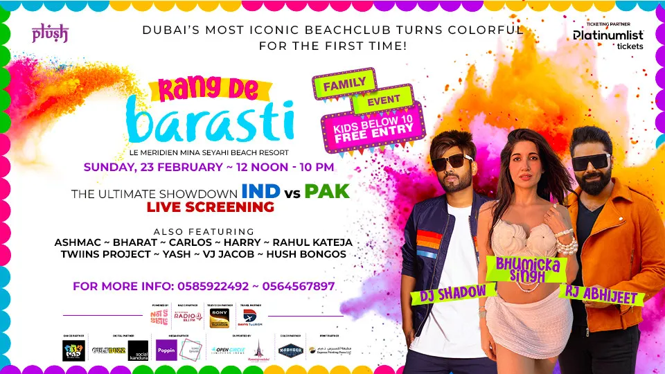 - Rang De Gulaal Holi at Dubai Creek Park – Dance to dhol beats, join a foam party, and watch the highly anticipated India vs Pakistan cricket match on a giant screen.