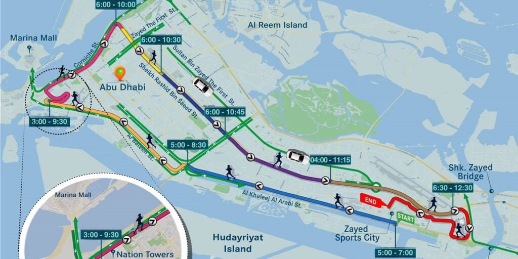 If you’re driving, be sure to check out the alternative routes highlighted on the map in green to avoid the closures in Abu Dhabi this Saturday.