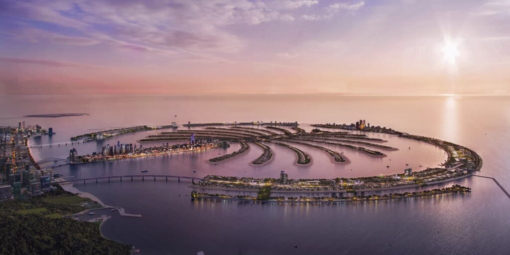 Dubai’s coastline is expanding with the massive Palm Jebel Ali project. Expected to be fully developed by 2040, this artificial island will span 13.4km and feature over 80 hotels, resorts, beach clubs, and a special ‘celebration village.’